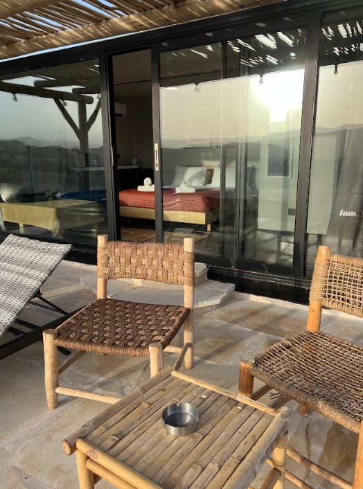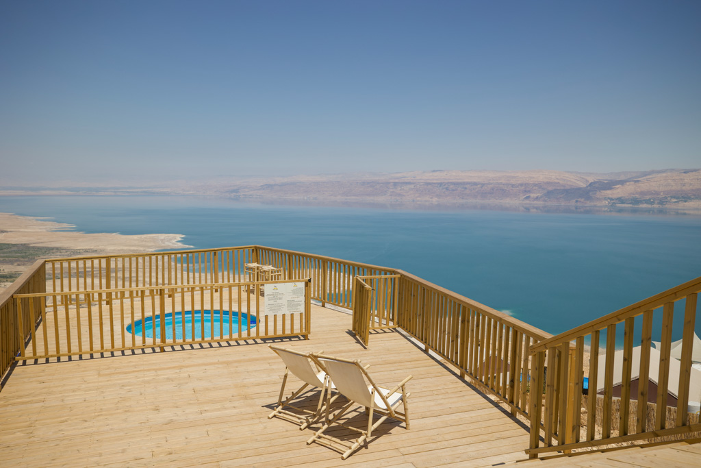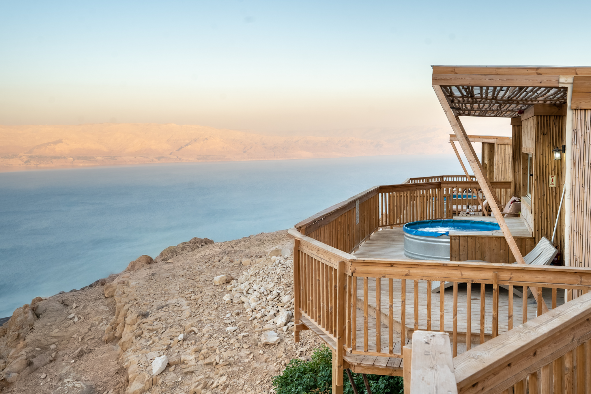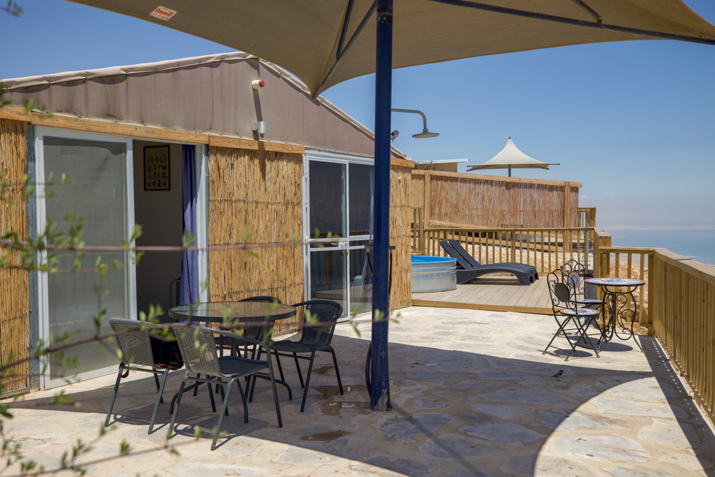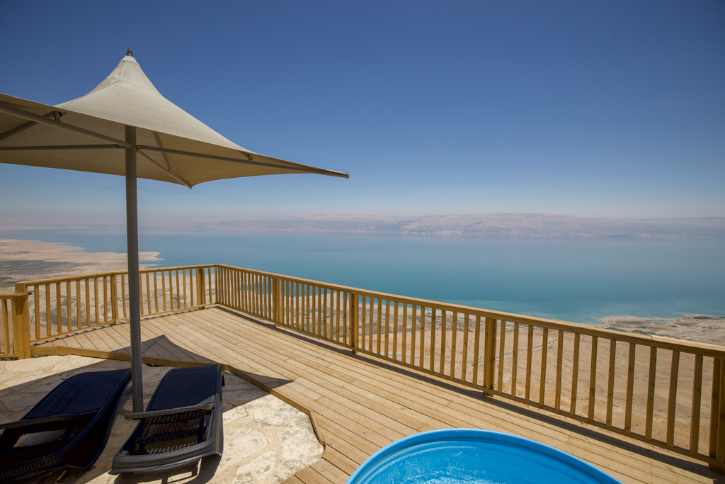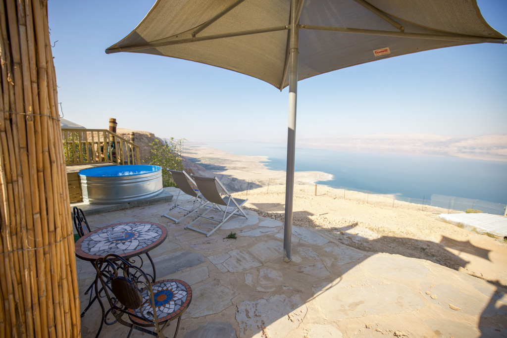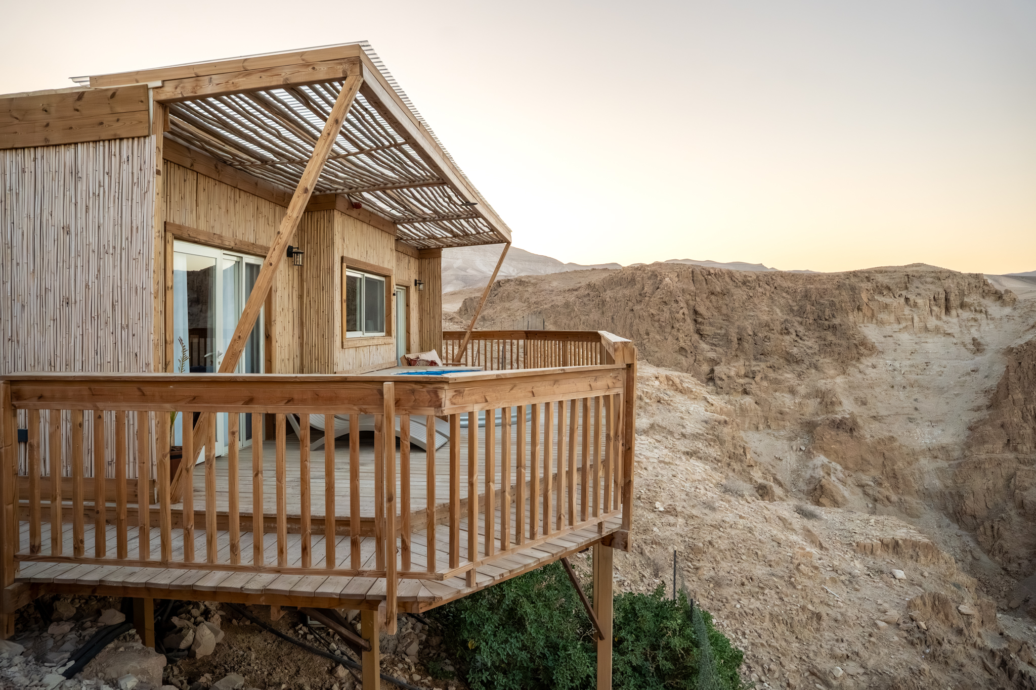 חדר זוגי במיקום פרטי ואינטימי, בקצה של המצוק, עם נוף מרהיב לים המלח וההרים לצד המצוק.